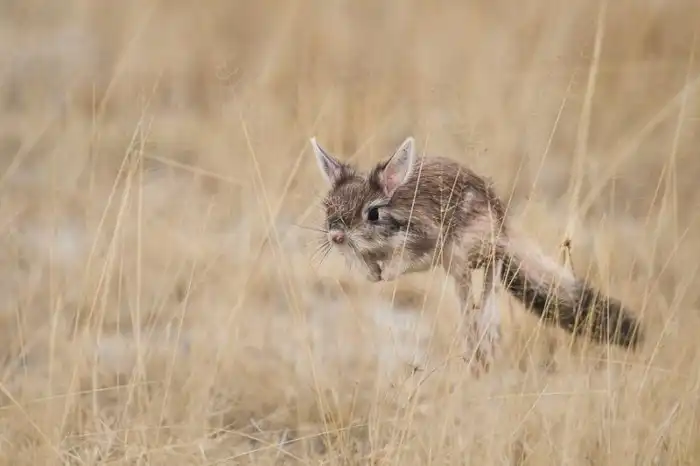 Нет, это не Пикачу, скорее плод страстной любви зайца, тушканчика и кенгуру. Непропорционально длинные задние ноги, такие же несоразмерно крохотные передние лапки и довольно большие уши (около 9 сантиметров) — всё это наталкивает на мысли о сомнительном тройничке. Но ни к первым, ни ко вторым, ни тем более к третьим наш герой отношения не имеет. Долгоног — представитель целого семейства имени себя любимого.