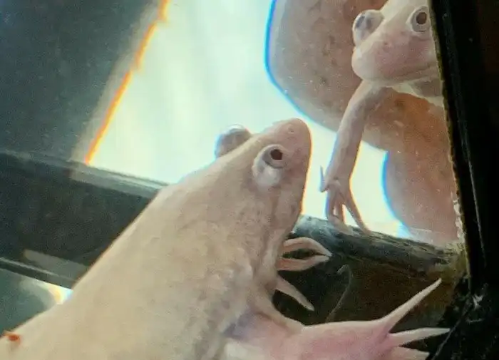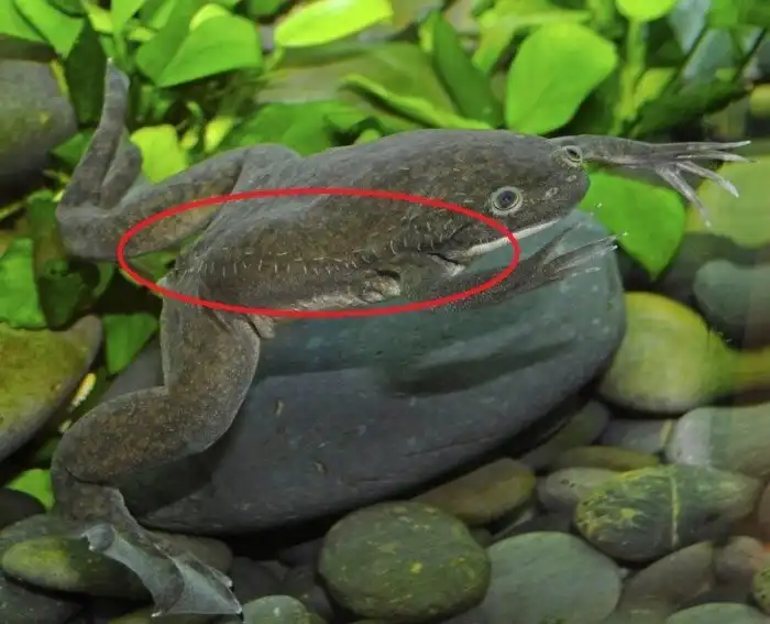 Но глаза — не единственный способ ориентации у ксенопуса. Свою принадлежность к классу «земноводных» лягуха никак не оправдывает — на сушу животина почти не выбирается. И поскольку в воде она живёт 24/7, у неё, как у рыб, появилась боковая линия, особый орган осязания. Выглядит эта полоса так, как будто зверушку сшили из двух разных кусков, причём кривыми швами. Но благодаря этому органу, пухляш улавливает мельчайшие колебания в воде.