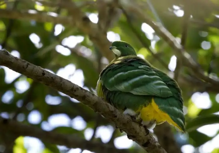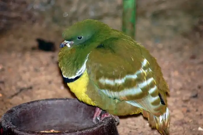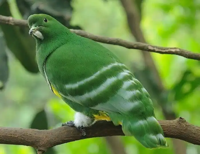 Этот птиц буквально амбассадор Сбербанка. Голубь зелен аки эмблема, а его крылышки рассекают 3 белых полосы, как на знаменитом логотипе! Лишь грудка и попец у него ярко-жёлтые — не всё же тело перекрашивать под цвета любимой компании, верно? Размером птиц с обычного, всем нам знакомого сизого голубя. Зато отжирается пернатый лихо, его средний вес — полкило!