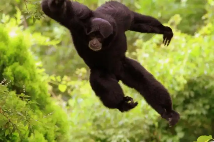 Но мало того, что наш герой актёр и певец от бога, так он ещё и каскадёр! Размах рук с лёгкостью доходит до полутора метров! Такие мощные лапищи нужны животинам не для обнимашек. Длинные руки — отличная фича для паркура по высоким деревьям, с которых обезьянки редко слезают. За раз сиаманги пролетают по 8—10 метров.