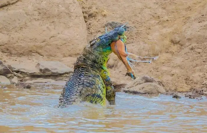 Фото отлично показывает насколько крокодил гигантский. Даже на фоне антилопы гну.