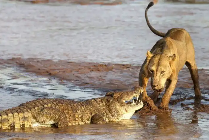 Даже на суше крупный крокодил непосильная добыча для льва, только обезумевший от голода прайд решается нападать на крокодилов. Только группой!