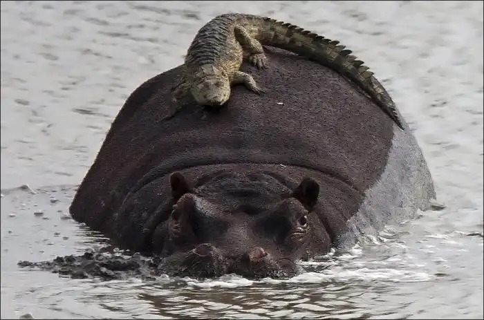 Уже трясётесь от страха? То ли ещё будет. Вы ведь помните, что кроме крокодилов в реках Африки живет ещё одно неистовое чудовище — бегемот? На беду местных жителей, два исполина спелись и мирно живут в одном водоеме. Самки бегемотов оставляют своих детей рядом с крокодилами, чтобы те отгоняли хищников, а молодые кроки могут запросто зависнуть на спине у бегемотов, чтобы погреться.