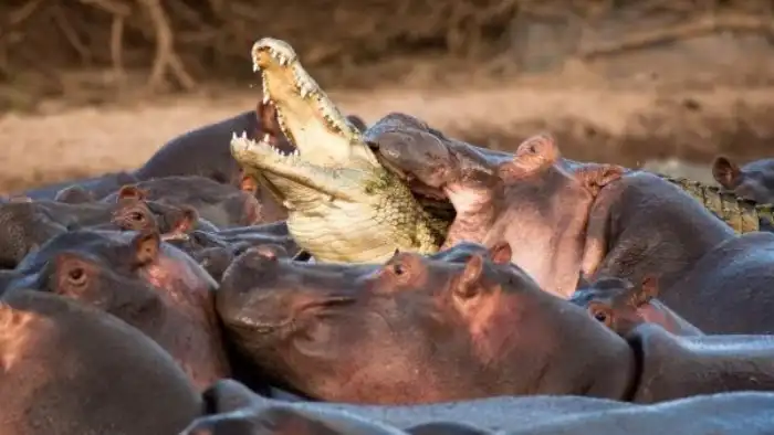 Бегемоты и крокодилы конфликтуют нечасто, но когда водоём начинает пересыхать, в тесноте сдают нервы и у тех, и у других.