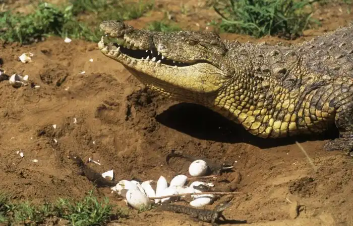 Чтобы донести детёнышей до водоёма, самка крокодила аккуратно берёт их в пасть и доносит их до ближайшей речки. Ближайшие 2 года мать будет оберегать потомство.