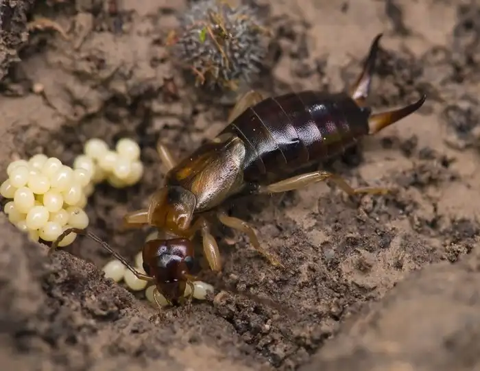 Любишь непристойности, люби и деточек воспитывать. Парочка уховёрток вместе ищет место для кладки и вырывает ямку, куда мамочка сносит 30-60 яиц. Кстати, родительница из уховёртки отличная. Сильная и независимая самка остервенело охраняет кладку ото всех, в том числе от других уховёрток, в том числе и от бати её детей. И это при том, что малышня проклюнется только к маю!