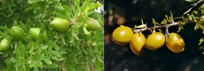 Начнём с деревьев. Это дерево – очень редкое, называется оно «аргания колючая» и произрастает только в южном Марокко, и больше нигде в мире. Созревшие плоды аргании чем-то напоминают маленькие заострённые с двух концов лимончики или сливы, привлекательного жёлтого цвета.