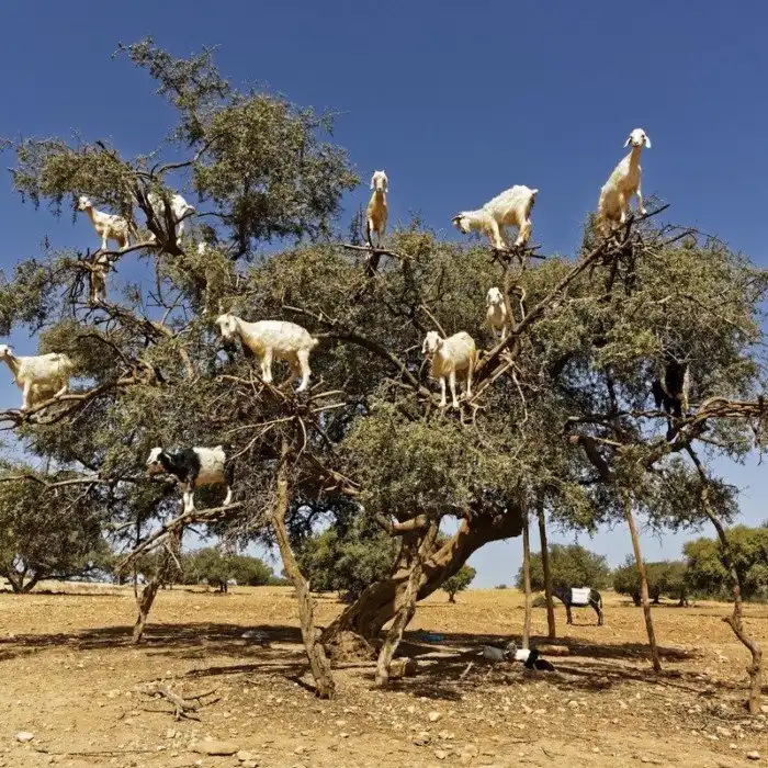 В Западной Африке, в Марокко, часто можно увидеть совершенно фантастическую картину: посреди сухой выжженной солнцем пустыни растёт зелёное дерево, на ветках которого сидит коза. Или две козы. Или даже много коз: