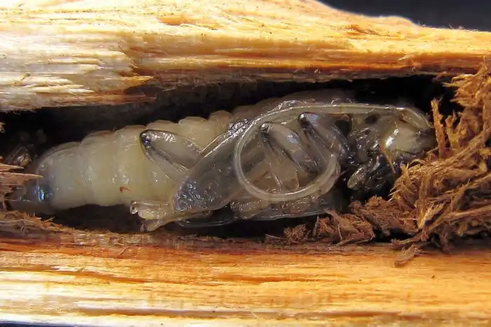 А связано это с пищевыми предпочтениями их червеобразных личинок, которых хлебом не корми — дай деревяшку заточить. Жизнь у личинки стригуна — то ещё удовольствие. Вся их диета состоит из твердокаменной древесины, которую не то что пережевать — откусить сложно! Титановыми челюстями они скоблят целлюлозные волокна, отгрызая щепочку за щепочкой.
