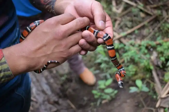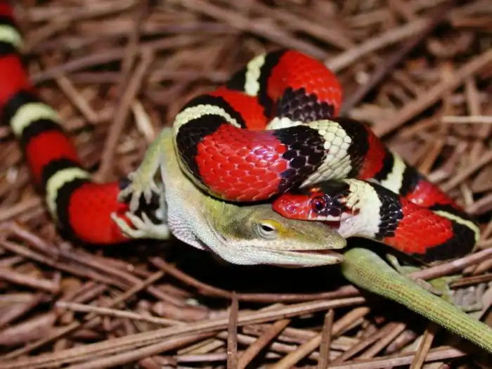Знакомьтесь, королевская синалойская змея. Шнурок метром длиной замечателен тем, что он отлично врёт. Нет, впаривать что-то из серии «небитая, некрашеная, пробег 7000 км» он вам не станет, его обман куда изящнее. Своей красно-чёрно-жёлтой расцветкой и местом прописки в Средней Америке он копирует кораллового аспида! Для тех, кто не в теме: коралловый аспид — это змея, убийственность которой может сравниться с такими токсичными гигантами, как королевская кобра и чёрная мамба.