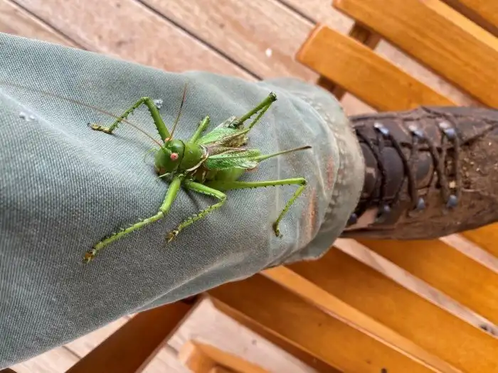 Даже крылья у него с сюрпризом: надкрылья — обычные зеленоватые, как у нормальных адекватных кузнечиков. А вот снизу прячутся яркие махалки в чёрно-голубых тонах. В живой природе такое сочетание цветов — самый настоящий аналог «весёлого роджера», говорящий: «НЕ ЛЕЗЬ, ДЕБИЛ, ОНО ТЕБЯ СОЖРЁТ!».