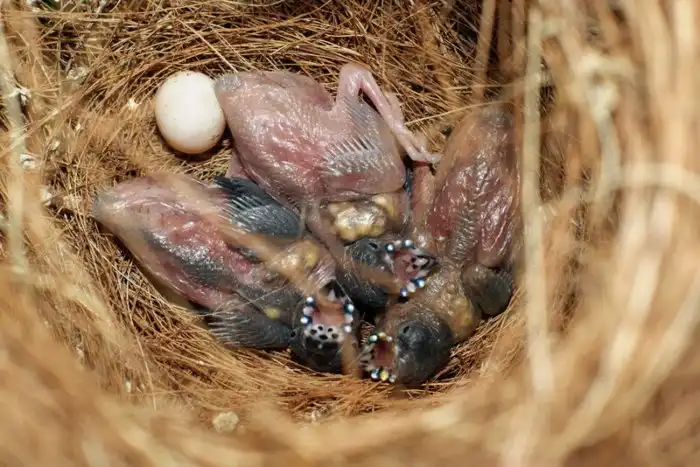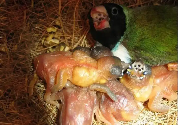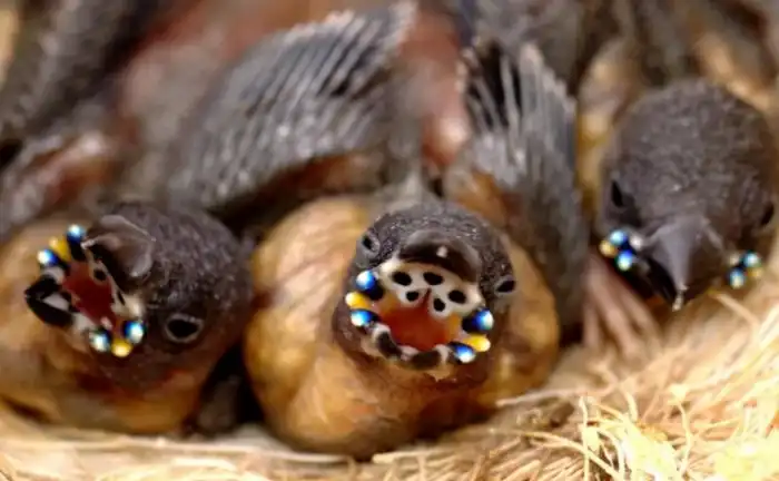 Ладно, нагнетать не будем. Кроме того, что стрёмный вид клюва сводит впечатлительных сапиенсов с ума, у него есть ещё одно предназначение. Природные светоотражатели нужны, чтобы родители могли сунуть еду птенцу в полной темноте. Эдакие посадочные огни. За 25 дней вся жуткая жуть пропадает, и происходит то самое сказочное преображение в нормальную птицу. Молодая амадина становится почти как родители, но до первой линьки остается серой и унылой.