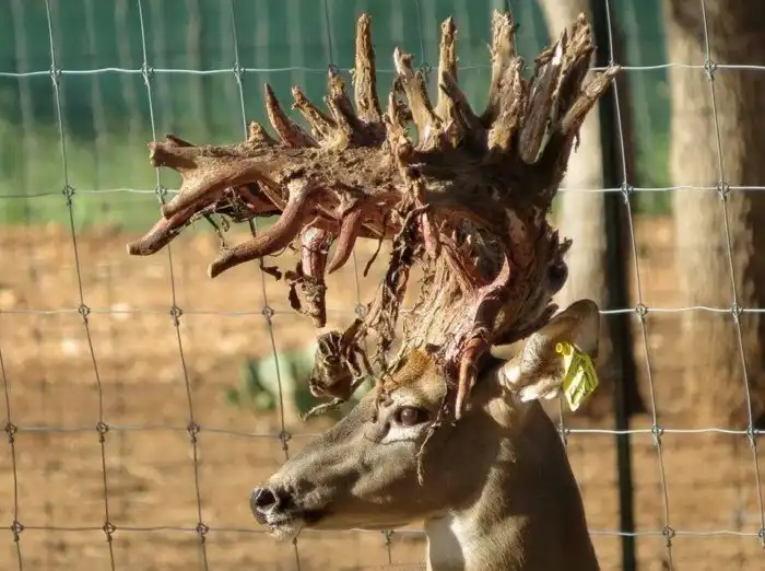 У этого парня со здоровьем, видимо, не очень. Случайные мутации во время роста рогов встречаются довольно часто. Это может быть связано как с плохими условиями жизни, так и случайным клеточным сбоем.