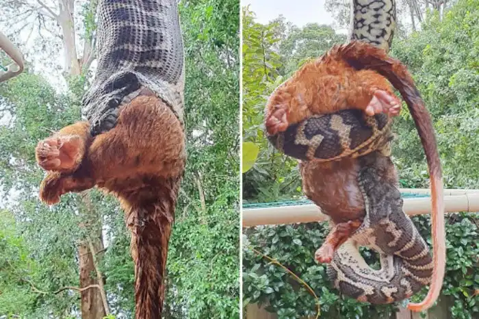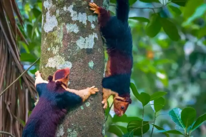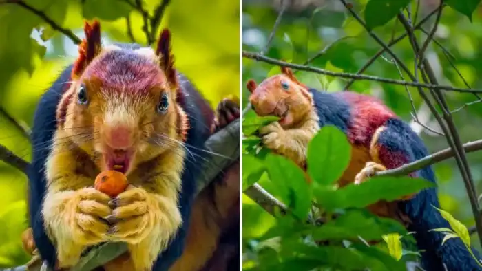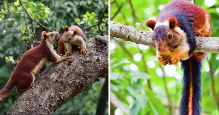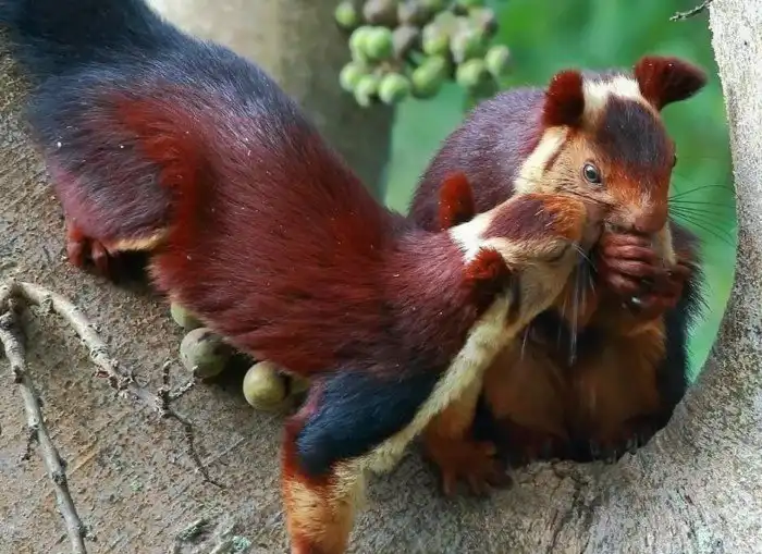 В некоторых районах Индии этим красавчикам знатно достается от местных сапиенсов. Но не из-за примитивных предъяв «пояснить за шмот», а из-за размеров. Ратуфа в два раза больше привычных нам белок, попрошайничающих в парках. От носа до кончика хвоста выходит почти метр, причем две трети — это хвост. Так что гигантская белка — это не только ценный трёхцветный мех, но целых 2 кило диетического мяса, что очень ценится как аборигенами, так и местными хищниками.