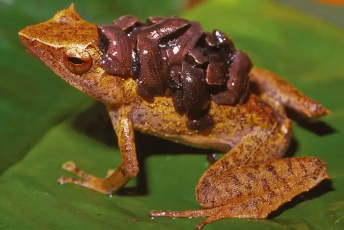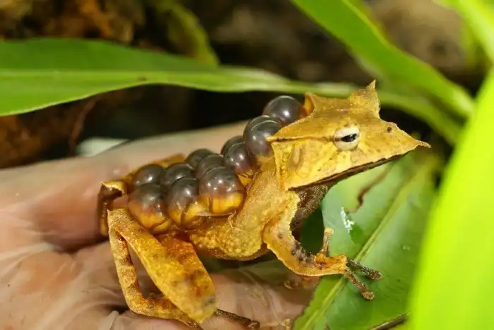 Для того, чтобы отложить икру, лягушкам обязательно нужна жидкость. Неважно: озеро или лужа — главное, чтобы было влажненько — это главное условие развитие головастиков. Но, увы, найти водоём в кронах высоченных деревьев — задача нетривиальная, так что лягушкам пришлось искать другой путь. И они-таки нашли его! Заботливые мамочки носят икру прямо в спине!