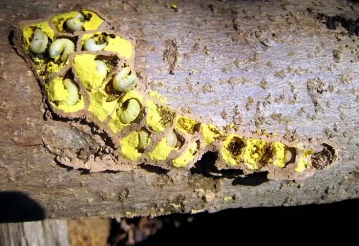 Затарившись съестным на одного проглота, мать откладывает яичко и буквально замуровывает личинку в калорийной вкусняшке из переработанного нектара и пыльцы — перге. Неудивительно, что они вырастают такими гигантами! Так повторяется до тех пор, пока нора не заполнится ячейками полностью. В одном таком домике может быть до 15 отсеков, в каждом из которых находится по будущему плотнику.