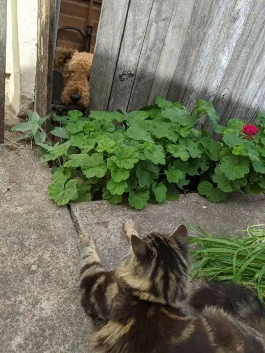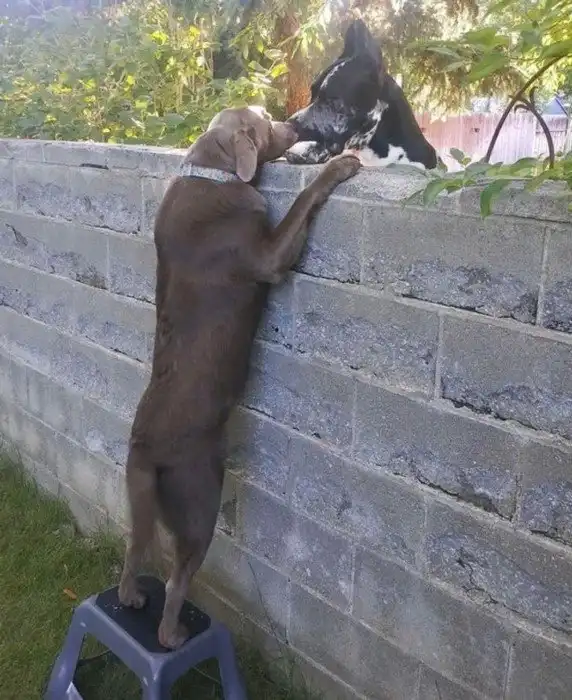 13. «Сосед прислал мне фотографию наших собак. Наконец-то они дали своему песелю табурет, чтобы он мог как следует поприветствовать своего большого друга»