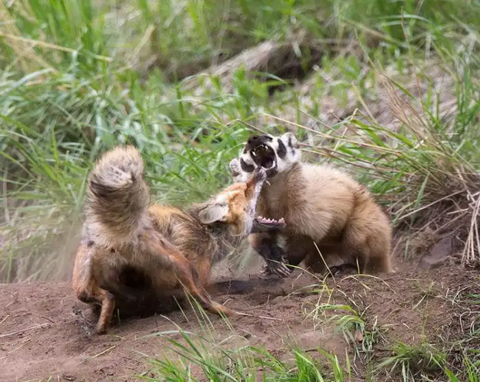 А вот с койотами барсуки подружились. Их симбиоз работает так: один добычу загоняет в нору, а другой её от туда вырывает.