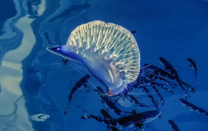 Португальским корабликом медузу назвали из-за необычной формы пузыря, который держит беспозвоночное на плаву.