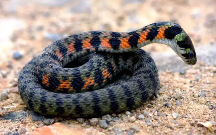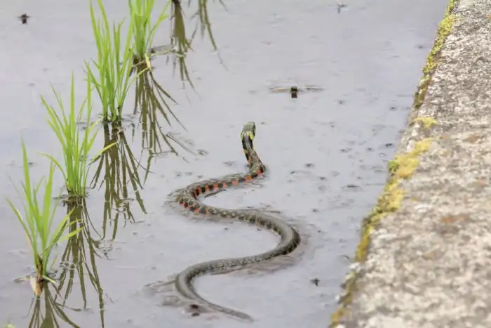 В воде тигровые ужи чувствуют себя так же комфортно, как и на суше.