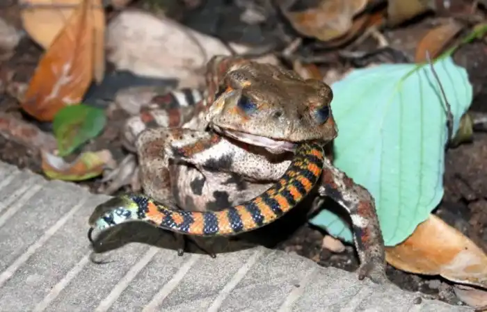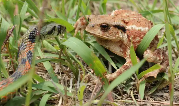 Вообще, на случай, если тигрового ужа начинают жрать, он выделяет яд из секрета на голове — токсин повреждает ткани слизистых. Только вот беда в том, что жаба к своему же токсину не восприимчива.