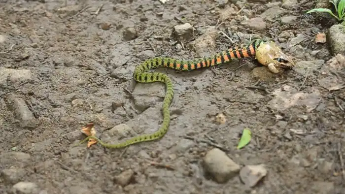 Так что встреча с тигровым ужом — это русская рулетка. Последствия укуса будут зависеть от того, сколько ядовитых жаб сожрал змей. И если для человека мизерные количества яда несмертельны (хотя пострадать заставят), то хищников своего уровня хитрая рептилия регулярно убивает.
