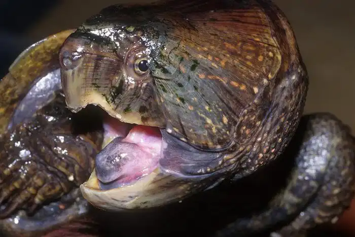 Но крутой черепаший клюв — это не только орудие убийства, но и шикарное скалолазное снаряжение. Цепляясь своей пастью, как альпинистским крюком, черепашка бодро карабкается по отвесным берегам пресноводных водоемов, где наша героиня любит зависать. А это, на минуточку, ручьи в горах, расположенные в 2000 метров над уровнем моря. Неопытные террариумисты так и вовсе шизеют, видя, как их питомица в рамках исследовательской программы жилища бодро шурует по занавескам вверх. Котики отдыхают, Спайдермен нервно курит в сторонке.