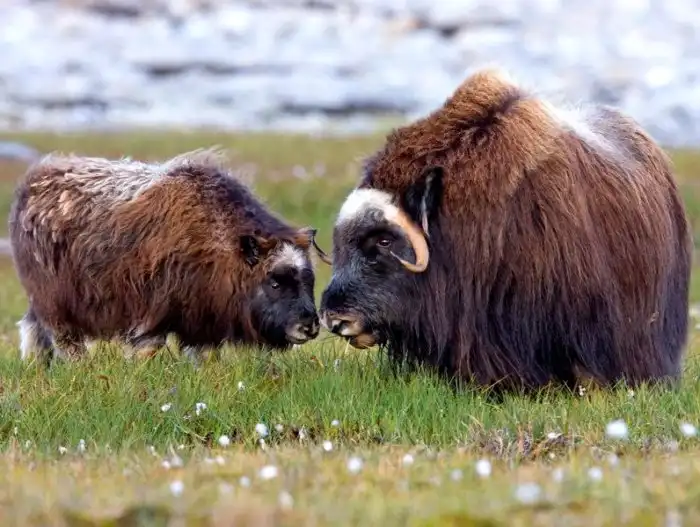 Овцебыки в борьбе за самок разбегаются и врезаются головами. Сила их столкновения равна тонне.