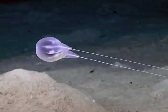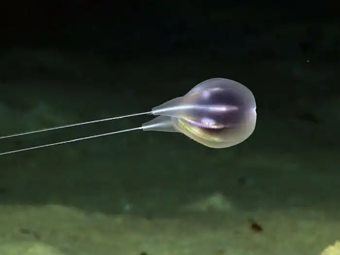 Но ученые ненадолго заинтересовались медузами, больше всего их внимание привлекало другое существо. По своему строению оно довольно сильно отличалось от «летающих тарелок» и скорее напоминало прозрачный воздушный шар с двумя свисающими вниз нитями. На нитях, благодаря высокому разрешению видеокамеры, биологи заметили мелкие реснички.