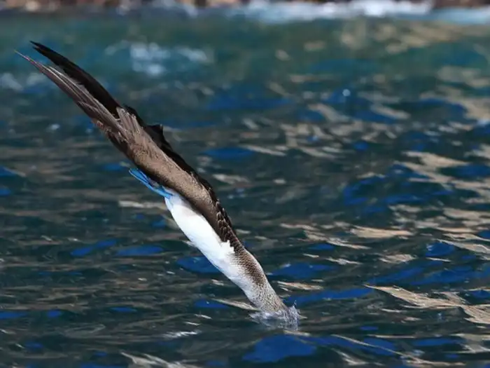 При нырянии в воду птица подтормаживает чтобы не пролететь мимо добычи. И лишь у самой поверхности складывает крылья и входит почти без брызг. Браво, олуша!
