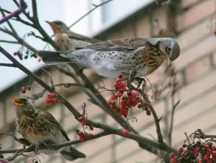 А вот дрозды и свиристели за здоровое питание! Птицы едят, по большей части, лишь ягоды рябины, которые остаются в городских парках и садах.