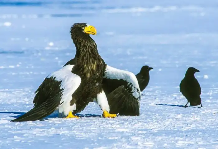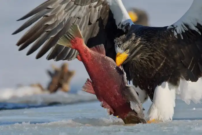 Наш герой, обитатель Сахалина и Курильских остров, больше символа США почти на треть: 110 сантиметров в длину и до 9,5 килограмм веса. Это одна из тяжелейших летающих птиц планеты! Чтобы поднять монструозную тушку в воздух, крылья орлан приделал себе соответствующие — 2.5 метра в размахе!