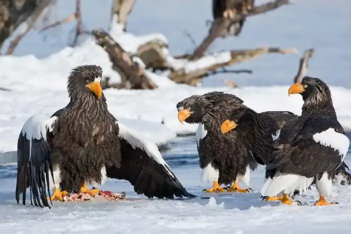 Ну а если свежей еды нет от слова совсем, птиц не побрезгует падалью. С габаритами орлана разъяснить его легитимность на чужой обед — дело несложное. Пернатый с лёгкостью уложит на лопатки любого, кто встанет между ним и халявной пищей.