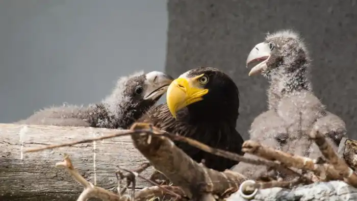 Лишь к 7 годам орланы принимаются любить друг друга. Семейный совет выбирает самое удобное из гнёзд и откладывает туда 2-3 яйца. После этого маман сидит с детками безвылазно, а батя начинает убивать за двоих. Через месяц главе семейства придётся поднатужиться ещё сильнее — молодёжь, как и мать, не воздухом питается!