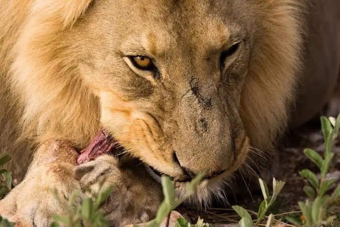 Туша поедается в определённом порядке. Сначала съедают сердце, потом печень и почки. Только съев эти органы, львы приступают к поеданию мяса с кожей.