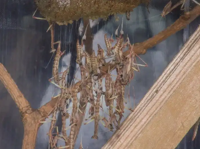 В остальном размножение веточных богомолов мало отличается от обычных. Самка сооружает гнездо из клейкой жидкости, которое называется оттека. Там то и созревают от 100 до 300 яиц.