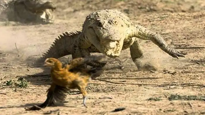 Деградировавший крокодил гонится за деградировавшим динозавром. Эволюция удивительна!