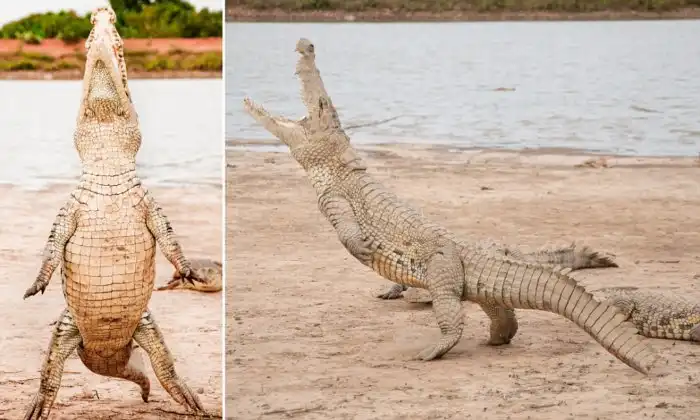 Во-первых, приглядитесь к положению лапок. Когда крокодил планирует отправиться в длинный переход, он поднимает свою тушку над землёй, и его ноги оказываются почти ровно под туловищем, обеспечивая рептилии мобильность. Подобный способ хождения свидетельствует о том, что все современные кроко произошли от подвижных наземных хищников. Да что там, современные крокодилы и сейчас галопом скакать могут!