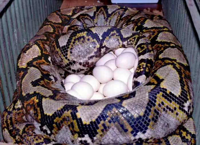 Да, до монструозных размеров доживают единицы, зато юные питоны появляются на свет сотнями! В зависимости от размеров самки, в одной кладке может быть от 10 до 100 яиц. Обвив яйца, мама-змея все 3 месяца инкубации согревает зародыши работой собственной мускулатуры. Змеюка не отрывается от детишек ни на миг, теряя до 40 килограмм своего веса!