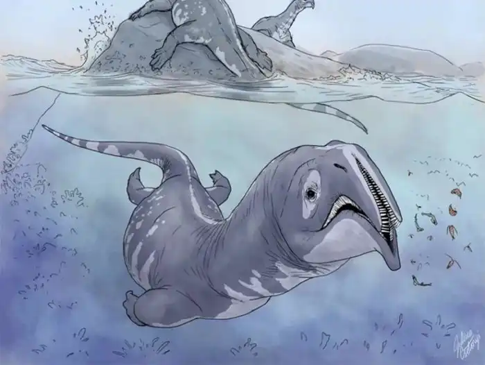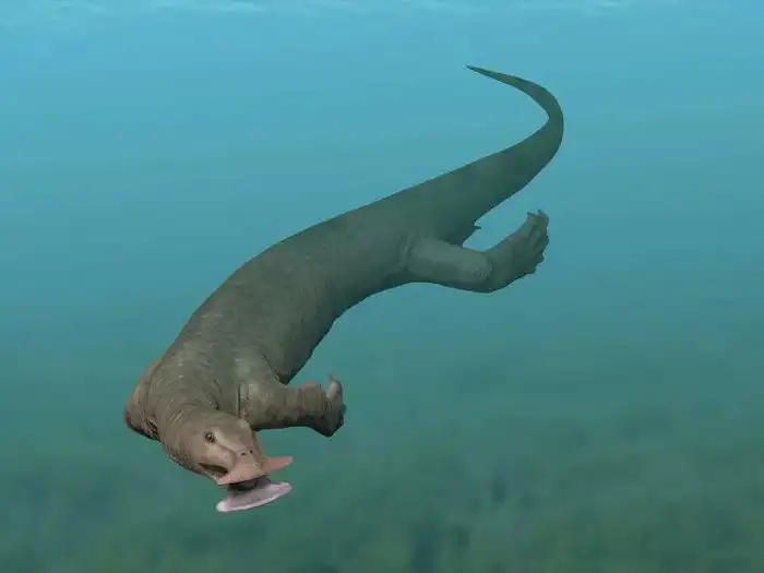 Клюв этот, правда, был у него широкий, кривой и с маленькими зубами. Сей конструкт крепился на гибкую шею, присобаченную к длинной сосиске-телу — идеальная обтекаемая форма для подводного передвижения. Ещё большую плавучесть придавали короткие перепончатые лапки. Добавьте к этому чудо-юду перьев, и вот вылитый селезень с бабушкиного двора готов. Только селезень гигантский — в длину лысый утконос занимал почти 3 метра.