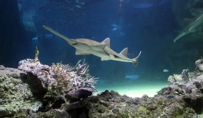 Пилорые скаты появились позже акул на 80 миллионов лет, но тоже обзавелись подобным приспособлением. Этот представитель морской фауны гораздо крупнее и вырастает до 7 метров. У скатов нет усов, их пилы симметричнее, а обитают они на прибрежном мелководье.