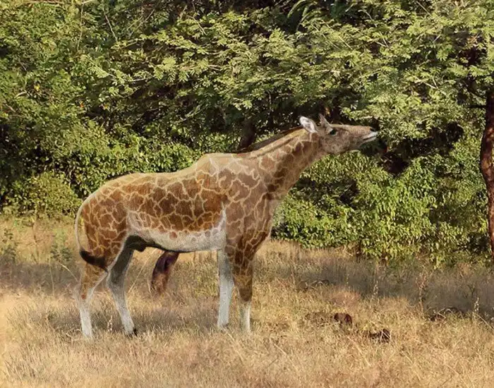 Предок долговязых копытных уже заимел ноги от ушей. Только вот шея у животины была куда меньше — рост зверюги был до 3 метров, отчего походил он скорее на кроликовую версию современных жирафов или версию XXL окапи.