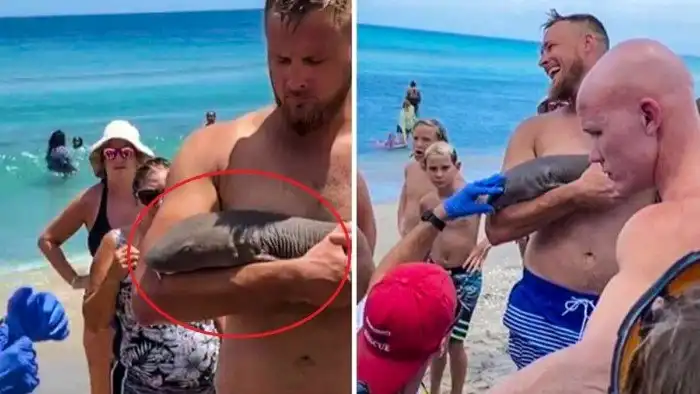 Какая ирония: с акулой нянькой нянчится человек. Ладно, он её не укачивает, просто рыба вцепилась в руку и не отцепляется.