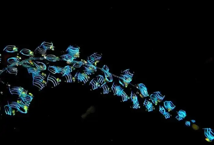Юные светящиеся сальпы сидят на материнском столоне. Считается, что свечение нужно для привлечения планктона.