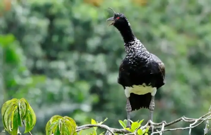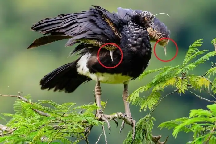 Вместо того чтобы фехтовать друг с другом рогами, птицы завлекают дам пением. Сказать, что оно на любителя — ничего не сказать. Громкие ушераздирающие звуки разносятся на все джунгли.