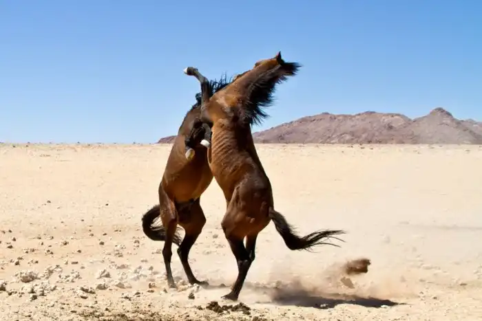 Тогда как все нормальные кони приспособлены к жизни в полных зелени степях, эти иррациональные животные живут на окраине пустыни Намиб. Условия для жизни там по-настоящему кошмарны: пастбищ и воды нет от слова совсем. Любая ошибка здесь карается смертью.