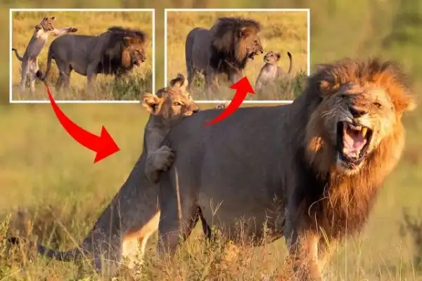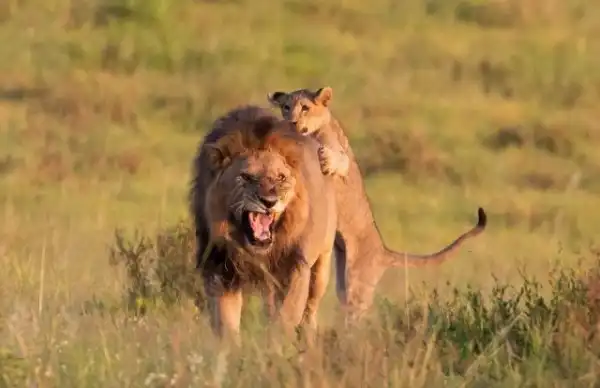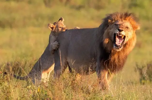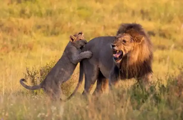 - Трое детенышей, которые уже были в игривом настроении, пошли к самцу. Один запрыгнул на него сзади и укусил. Лев грозно зарычал и малыш понял, что так делать нельзя."