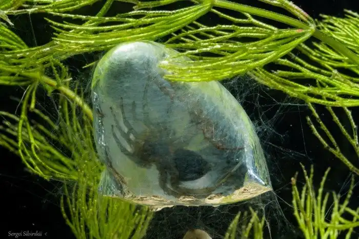 Только вот таскаться каждые 15 минут за новой дозой О2 задача не только нудная, но и опасная: насекомоядные птицы не дремлют. Паук нашёл изящное решение этой проблемы — он строит подводный колокол! Обнаружив подходящее скопление палочек и водорослей, паукан распускает свои сети.