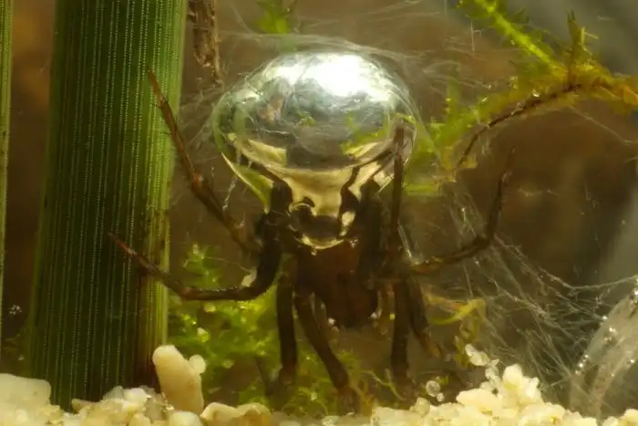 Как и все прочие пауки, наш герой не имеет жабр или их аналогов. Он дышит своим задом... И вот тут на помощь приходит повышенная волосатость: мех на брюшке покрыт жирненьким веществом, оно отталкивает влагу. Пауку-аквалангисту достаточно вылезти на поверхность, а потом резко нырнуть. Жир оттолкнёт воду, а между волосками задержится воздух. Вуаля — запас кислорода на пятой точке пополнен!