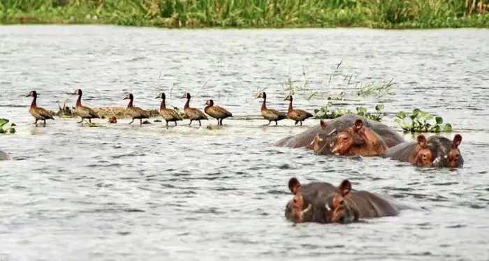 Египетские гуси настолько преисполнились в своей силе, что не боятся тусоваться даже рядом с бегемотами — самыми опасными животными Африки.